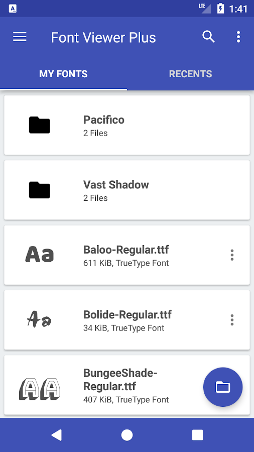 • پوشه فونت سفارشی برای دسترسی سریع. • مشاهده سریع و پیش نمایش در پوشه فونت سفارشی و فونت های اخیر. • گزینه جستجو برای پوشه فونت سفارشی و فونت های اخیر. • ورودی متن سفارشی • پشتیبانی از فایل های ttf، فایل های OTF و فایل های Woff. • فونت ها را به طور مستقیم از مدیر فایل یا از برنامه به طور مستقیم باز کنید. • تغییر اندازه فونت، رنگ متن و رنگ پس زمینه. • تنظیم متن پیش فرض و هم ترازی. • مرورگر فونت اخیر • پشتیبانی از تبلت. • پشتیبانی از آیکون های سازگار با Android.